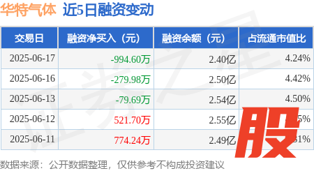 本站消息,6月17日加配网,华特气体(688268)融资买入356.41万元,融资偿还1351.01万元,融资净卖出994.6万元,融资余额2.4亿元。