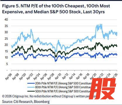 拉出过去30年每个月S&P 500成分股的远期市盈率分布,分别追踪第20、第50、第80百分位的估值走势:当前,第20百分位(最便宜的五分之一)NTM P/E为12.4倍,处于30年历史的70%分位;第50百分位为19.1倍,处于88%分位;第80百分位为29.9倍,处于89%分位。