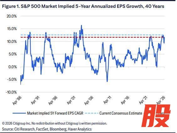 标普500从4月低点大幅反弹之后,估值问题重新摆上台面。市场当前的定价逻辑,要求未来五年EPS实现年均超过11%的复合增长,而这一水平在过去四十年里几乎从未被持续兑现——唯一例外是2000年科技泡沫顶峰。当这个增长门槛被抬得如此之高,任何一点基本面的噪音都可能触发剧烈反应。