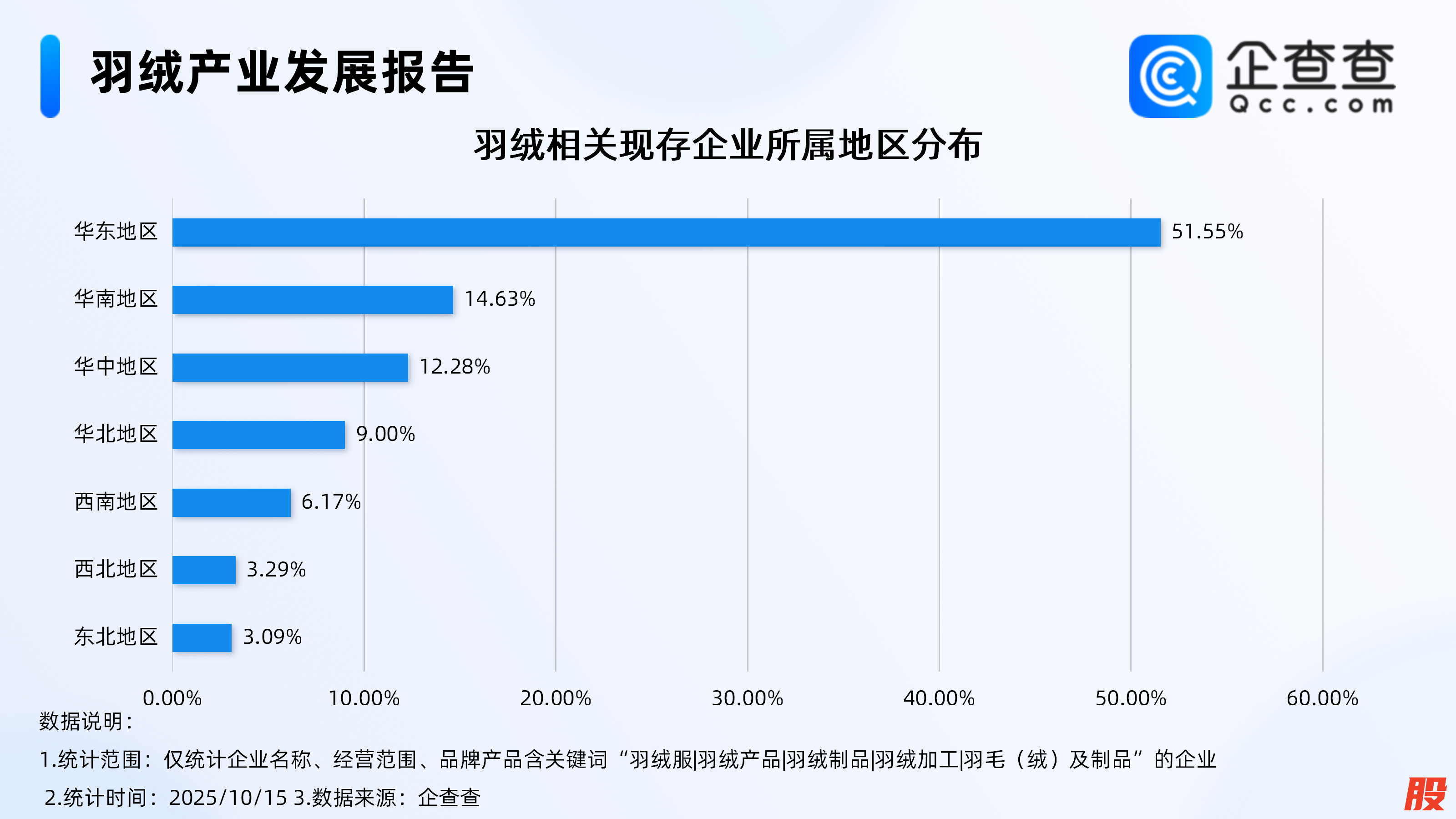 据报道,最近一股较强冷空气将席卷我国,北方入冬进程会加快,江南华南将正式入秋。本周末,北方大部最高气温不足15℃,华北最低气温降至5℃上下,东北降至冰点以下。伴着日渐转凉的天气,街头巷尾的人们裹紧了外套,电商平台的羽绒服双十一预售链接早已挂满首页,不少人已经开始着手囤积抵御寒冬的“保暖利器”。企查查数据显示,截至10月15日,国内羽绒相关企业现存量达37.11万家,主要分布在华东地区,占比达51.55%。从成立年限上看,超6成相关企业成立于近3年,其中成立年限在1-3年的相关企业最多,占比达36.71%。注册量方面,近十年羽绒相关企业年注册量整体上升趋势,2024年注册量达8.41万家,截至目前,今年已注册8.1万家,其中前9月注册量达7.88万家,同比增长24.37%。1、主要分布在华东地区